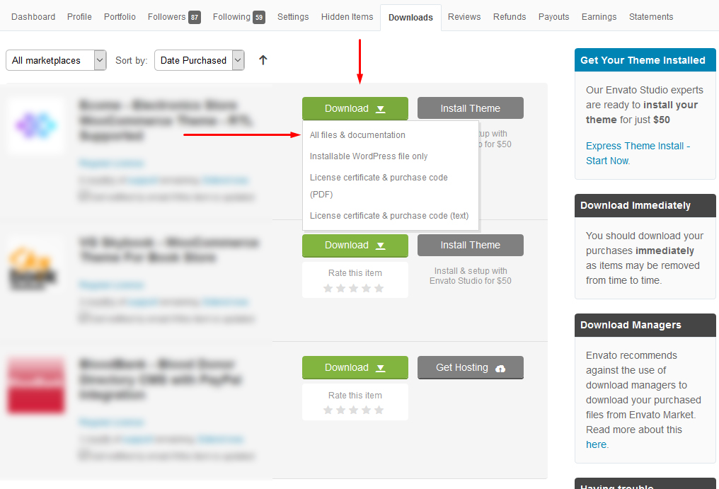 1. Download the theme zip file from your Envato account from ThemeForest. download