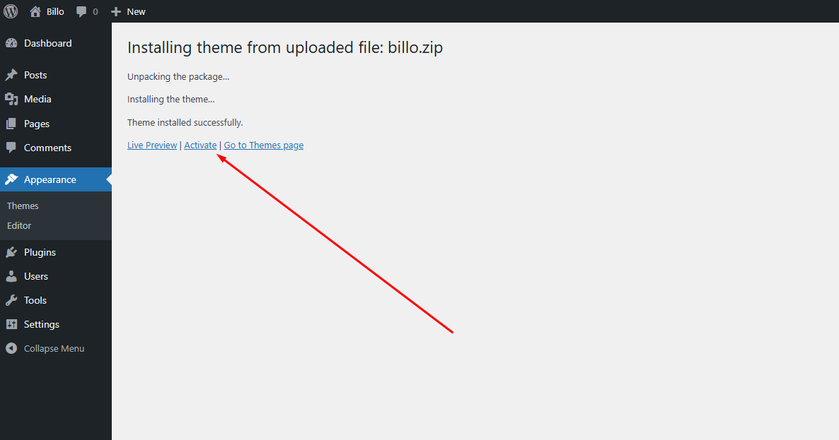 Once uploaded, activate the theme by heading to the “Themes” menu in the WordPress Dashboard. Locate the Billo Theme and hit “Activate”.