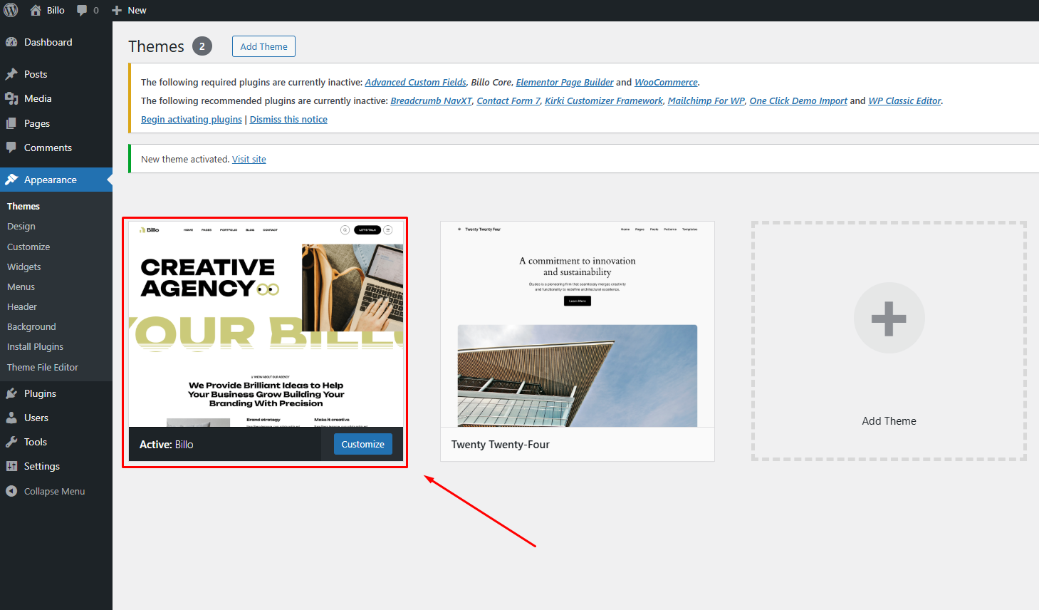 8. When the installation complete, click Activate. You will be redirected to Themes page with Billo activated.
