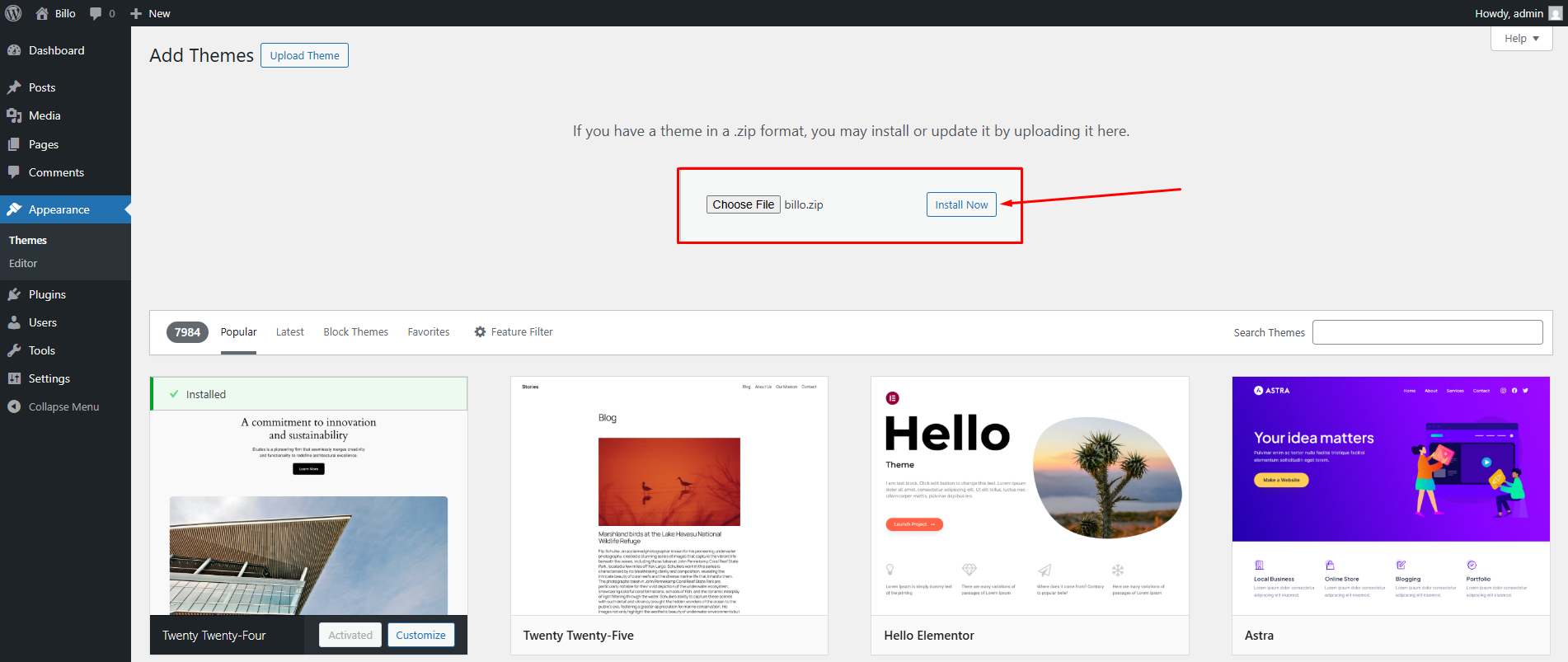 Note: When uploading your theme with the installer, please ensure you are uploading the theme .zip file, not the entire package you downloaded. In this case, you will be uploading billo.zip